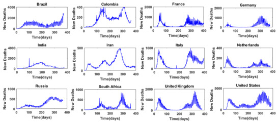 Figure 1 presents, for example, the time series of daily COVID-19 cases in 12 selected countries, and Figure 2 presents the time series of daily COVID-19 deaths in these 12 countries. These 12 countries are: Brazil, Colombia, France, Germany, India, Iran, Italy, the Netherlands, Russia, South Africa, the United Kingdom, and the United States. They are selected for the purpose of illustration here, and detailed results are presented only for these 12 countries. It may be noted that these countries also cover almost all the major continents (Africa, Asia, Europe, North America, and South America). As can be seen from Figure 1 and Figure 2, there are some notable differences in the variations of the daily COVID-19 cases and daily COVID-19 deaths among the different countries. This seems to suggest that the selection of these 12 countries for the purpose of illustration of the complexity of COVID-19 cases and COVID-19 deaths around the world is reasonable.