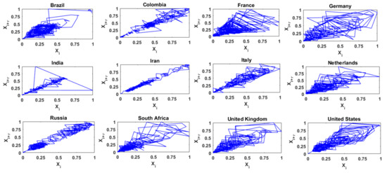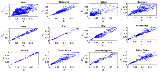 Figure 6 presents the two-dimensional phase space diagrams for the time series of daily COVID-19 deaths in the 12 countries mentioned above. As seen, the phase space diagrams for the 12 series of COVID-19 deaths exhibit significant differences among themselves. For most of the countries, the trajectories for the series of COVID-19 deaths occupy a large region in the reconstructed phase space, suggesting a relatively high level of complexity. The trajectories for the series of COVID-19 deaths from only Iran and Russia, and, to some extent, Colombia, Italy, and the United States occupy a relatively narrow region, suggesting a relatively low level of complexity. It may be noted that a comparison of these phase space diagrams for the daily COVID-19 deaths with those for the daily COVID-19 cases seems to indicate that the complexity of the former is greater than that of the latter (see Section 4 for additional details).
