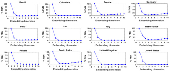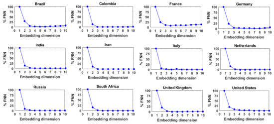 Figure 4 presents the results of the FNN analysis for these 12 series of daily COVID-19 cases, with τ = 1. As can be seen, for all the 12 series, the %FNN value generally decreases with an increase in the embedding dimension up to a certain point and then saturates or slowly increases after reaching the minimum. The optimum embedding dimensions or FNN dimensions (i.e., the embedding dimension that yields the lowest %FNN value) for these 12 series of daily COVID-19 cases are found to be 5, 4, 4, 7, 6, 3, 7, 4, 4, 4, 4, and 7, respectively. These low- to medium-level dimension values seem to suggest that the dynamics of the daily COVID-19 cases in these 12 countries exhibit low- to medium-level complexity. The dimension values also suggest that the daily COVID-19 cases in these 12 countries are dominantly governed by 3 to 7 variables, as appropriate for the individual countries.