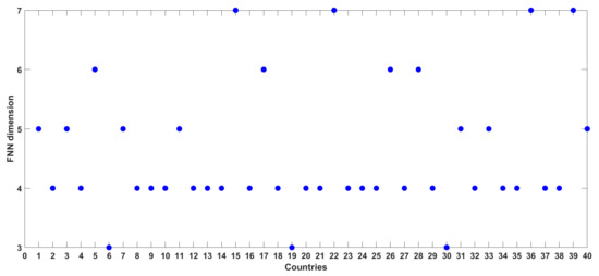 Figure 5 presents the FNN dimension results for the time series of COVID-19 cases from all the 40 countries/regions considered in this study. The numbers (on the X-axis) in this figure correspond to the numbers for the countries/regions listed in Table 1. The FNN dimensions for the 40 series of COVID-19 cases range from 3 to 7, i.e., the same range for the 12 countries illustrated above. The break-down of the dimensions is as follows: Three countries (Belgium, Iran, and Portugal) have an FNN dimension of 3; 22 countries/regions (including Europe, European Union, and South America) have an FNN dimension of 4; seven countries/regions (including Africa, Asia, and World) have an FNN dimension of 5; four countries/regions (including North America) have an FNN dimension of 6; and four countries (Germany, Italy, Turkey, and the United States) have an FNN dimension of 7. Again, these low- to medium-level dimension values seem to suggest that the dynamics of the daily COVID-19 cases in the 40 countries exhibit low- to medium-level complexity and that they are dominantly governed by 3 to 7 variables, as appropriate for the individual countries/regions.