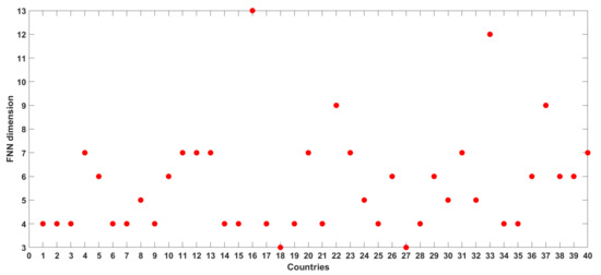 FNN dimension results for daily COVID-19 cases from 40 countries/regions.