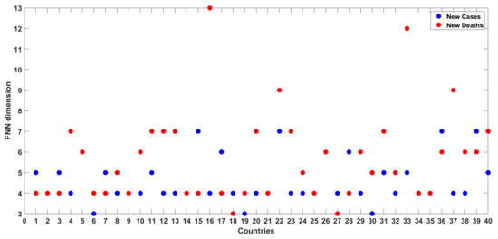 Comparison of FNN dimension results for daily COVID-19 cases and COVID-19 deaths from 40 countries/regions.