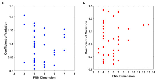 These observations suggest that a direct relationship between the results from linear methods (e.g., CV) and those from nonlinear methods (e.g., FNN dimension) on the variability or complexity of a system may not always be possible to achieve. This interpretation is also consistent with that reported by several earlier studies that have applied the concepts of chaos theory, including the FNN method, in many other contexts [52,53].