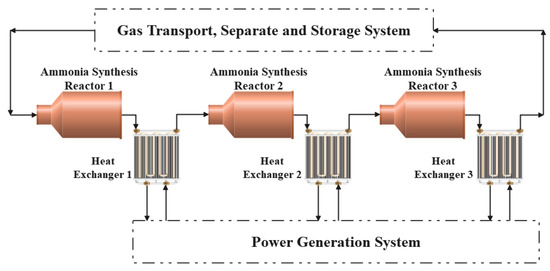 However, the existing studies of ammonia synthesis exothermic reactors mainly focus on single-tube reactors, with the maximum exothermic rate as well as the minimum exergy destruction rate as their analysis and optimization objectives [8,9,10,11,12,13,14,15]. Due to the small diameter, the exothermic rate is generally about 1–4 kW, which does not fully meet the demand for power generation measured at a megawatt or even ten-megawatt level. To improve the total exothermic rate and promote the engineering practice of the heat storage system using the technology accumulation of industrial ammonia synthesis, the industrial Braun-type ammonia synthesis reactor is introduced into the heat storage and power generation system as the exothermic reactor for ammonia synthesis.