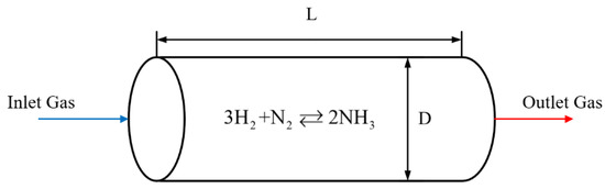This paper uses a one-dimensional model, and the ammonia synthesis reactor tower can be simplified to a tubular filled-bed reactor with a large diameter. The gas is thoroughly mixed uniformly in the radial direction, the radial temperature difference inside the reactor and heat exchanger is ignored, and no back-mixing occurs during the axial flow. A model diagram of a tubular filled-bed ammonia synthesis reactor is shown in Figure 2, and its relevant parameters are listed in Table 1.