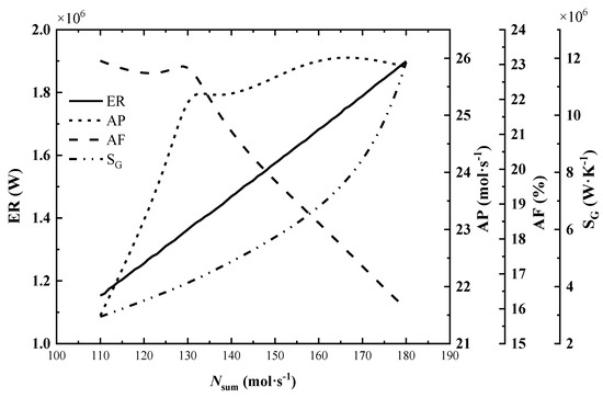 The variation of total exothermic rate (ER), total entropy generation rate (SG), ammonia production rate (AP) and exit ammonia molar fraction (AF) with the increase in inlet molar flow rate is shown in Figure 5.