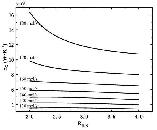 As shown in Figure 6, under different molar flow rates, the variation of total entropy generation rate is different. When the inlet flow rate is 150 mol/s and below, the total entropy generation rate increases slightly and then decreases slowly; when the inlet flow rate is 160 mol/s and above, the total entropy generation rate decreases continuously with the increase in hydrogen-nitrogen ratio, and the larger the inlet flow rate, the more significant this decrease is. So, when the inlet flow rate is large, the hydrogen to nitrogen ratio should be increased as much as possible to effectively reduce the total entropy generation rate with little effect on the total exothermic rate.