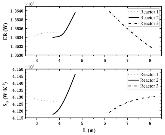 The different lines in Figure 7 represent the length change process of different reactors, and the comparison between the top and bottom shows that: in the calculation range, as the length of reactor 1 increases, the total heat release rate increases and the total entropy generation rate decreases, and the change process tends to be smooth, so reactor 1 should be longer within a reasonable range. The increase in reactor 2 length will incease the total heat release rate and the total entropy generation rate simultaneously. Therefore, it is necessary for reactor 2 to coordinate between the two indexes to obtain a better length. As the length of reactor 3 increases, the total heat release rate decreases and the total entropy generation rate increases, so reactor 3 should be as short as possible.