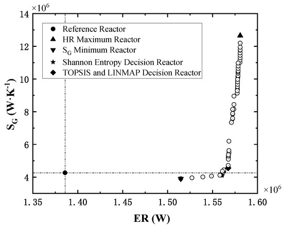 Through univariate analysis, the influence of each structural or operation parameter of the reactor on the overall performance is investigated, and combining with the parameters of the reference reactors, the parameter interval of multi-objective optimization is clarified. Finally, with the minimum entropy generation rate and maximum exothermic rate as objectives, a total of seven variables, including inlet molar flow rate, lengths and inlet temperatures of the three reactors, are simultaneously optimized to obtain the Pareto fronts. The objective function and constraints of the optimization problem are as follows: