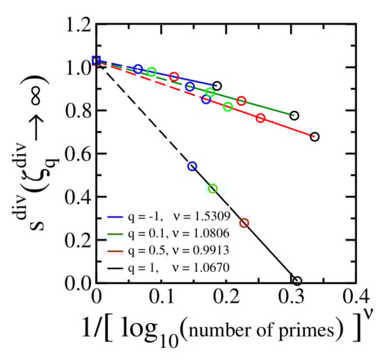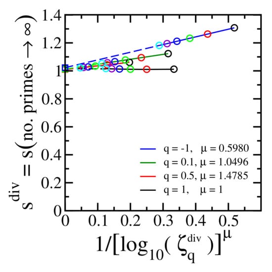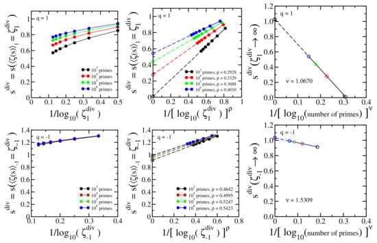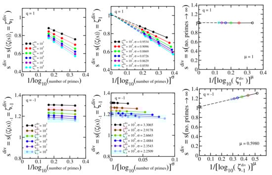 We numerically identify the location of the divergence by fixing an arbitrary value of noted as and identify the corresponding the value of s (noted as ) with increasing number of primes. The procedure is repeated with increasing values of . The three top panels of Figure 3 illustrate the procedure for , and the three bottom panels for . Each curve in Figure 3 (top left) displays the value of for which with increasing numbers of primes ( primes, shown with solid circles). The representation with in the abscissa is not a straight line, and we empirically found that introducing a power ( depends on ) as shown in Figure 3 (top middle), straight lines emerge, which can be extrapolated (dashed lines) to infinite number of primes — the open circles at the ordinate axis. These extrapolations correspond to infinite number of primes, but, nevertheless, the values of are still finite. Finally, the limit is achieved as illustrated in Figure 3 (top right). The open circles at the ordinate axis of Figure 3 (top middle) are represented in Figure 3 (top right) for each value of , identified with their respective colors, with the change of variables in the abscissa. is an empirical power that transforms the curves into straight lines ( depends on q; ). A final extrapolation is then allowed, identifying the location of the divergence (open square). The difference characterizes the numerical error. We use the same procedure for , and the three bottom panels illustrate the case .