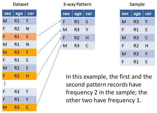Figure 1 shows a population with 3 attributes, age, sex, and car make, which are assumed to have been recorded as a finite dataset. Four of the records exemplify a pattern. Of the many different possible samples, the 6-record sample in the figure happens to follow this pattern.