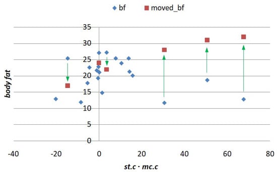 In order to exhibit the interaction, we modify some values on the bf column so that they follow their corresponding product term, seeking to display a more definite trend. This is accomplished by plotting bf against and dragging some points up or down to make the graph more linear and less horizontal. For convenience in constructing the graph, we use transformed versions of and centralized with respect to their means. The new, modified points are shown in Figure 2, with arrows pointing at the squares that will replace the original diamonds.