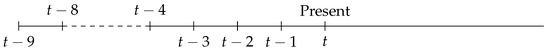 Specifically in this article, we use three genetic sequences, in the Fasta format—one from China and the other two collected in Brazil. Our selection is based on the discoveries made in [3,4] that have allowed us to know the stochastic behavior of these sequences. The sequence MN908947.3, coming from a patient of Central Hospital in Wuhan (Hubei, China), can be obtained from the free base NCBI. It is the first SARS-CoV-2 complete genome sequence registered in the literature, see [15]. In [3], we model this sequence (using its Fasta format), and the resulting model is a PMM model with interstice on the alphabet As introduced in [3], the model was selected using the BIC criterion. This model is very natural for genetic behavior. To the usual parameter o (see Definition 8), we add a new parameter which means that a piece of extra information about the behavior of the sample further in the past needs to be incorporated into the model to better catch the stochastic behavior of the sequence. In this case, (since we deal with the genomic alphabet, which is organized in triples), and (see table 6 (right) in [3]). Then, in the compression process, we need to report two parameters and We have a continuous past of size and a gap between positions 4 and 8 in the past, the value in the position being used to define the states of the state space, as illustrated in Figure 1. Each state of the state space is composed of a value (from the alphabet ) associated with the distant past located 9 positions behind position t and a triple of values related to the positions and ; then, each state is
