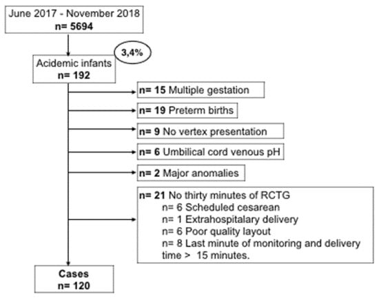 The outcome of the study was neonatal acidemia defined as pH < 7.10, measured by arterial cord blood at birth, these are the cases of the analysis. From the 5694 women in the initial cohort, 192 (3.4%) infants were acidotic. In Figure 1 we show the flowchart of the study, 72 acidemic fetuses were excluded from the analysis for lack of criteria. The remaining 120 infants with arterial acidemia were included as cases, together with 258 in the control group. The controls were selected using a non-randomized 1:2 consecutive type method; each selected control is chronologically consecutive to a case, selecting two controls for each case.