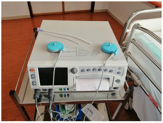 Currently, the universal method for the surveillance of intrapartum fetal well-being is the continuous monitoring of fetal heart rate (FHR) and maternal uterine contraction (UC) signals []. Electronic fetal monitoring (EFM) requires complex electronic devices developed to acquire, process, and display the signal. In the intrapartum period, an ultrasound transducer is used for the external FHR monitoring. This transducer contains piezoelectric effect crystals that convert electrical energy into ultrasound waves and uses the Doppler effect to detect movements of the cardiac structures [,]. In this context, several systems have been developed for central monitoring of fetal signals to provide simultaneous display of multiple tracings on several locations, allowing easier monitoring of signals []. The rate and pattern of the fetal heart are displayed on the computer screen and printed onto special graph paper.
