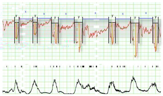 Intrapartum electronic fetal monitoring analysis (1 cm/min). The panel contains the fetus signal (above), where the following parameters can be observed: decelerations (y), time of reperfusion (x), and depth of deceleration (z); and the mother’s uterine contractions measured in mm Hg (below) not used for the analysis.