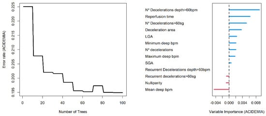 The AUC value in training data was 0.991 (0.984–0.999 95% C.I.), and 0.865 (0.774–0.955 C.I.) in validation data. We found a slightly greater discrimination ability than that obtained with the logistic regression model in the validation data. Random forest is an additive model of classification trees where each model is built with different data and set of variables, to quantify the effect of the predictor variables to predict acidemia, we show in Figure 4 the variable importance (VIMP) plot. The VIMP measures the difference between prediction error under a perturbed predictor, where a permutation is designed to push a variable to a terminal node different than its original assignment, and the original predictor, these are calculated for each tree and averaged over the forest. This yields Breiman–Cutler VIMP []. The most influential variables in the prediction of acidemia were the number of decelerations with a deep greater than 60 beats per minute, the reperfusion time and the number of decelerations greater than 60 s.