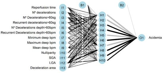 Additionally, neural networks were trained with different architectures. We used the multilayer perceptron model with 1 or 2 hidden layers, different activation functions, initial weights, and training parameters. The best model on validation data was attained using the 13-10-1 architecture with 151 weights, and the activation function was logistic. The cross-entropy was used as the optimization function, this loss function measures the discrepancy between predictions and real occurrence of acidemia.