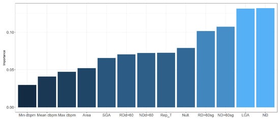 Variable importance in neural network. dbpm: deep in beats per minute; SGA: small for gestational age; RDd > 60: recurrent decelerations depth > 60 beats per minute; NDd > 60: number of decelerations depth > 60 beats per minute; Rep_T: reperfusion time; Null: nulliparity; RD > 60 sg: recurrent decelerations > 60 s; ND > 60 sg: number of decelerations > 60 s; LGA: large for gestational age; ND: number of decelerations.