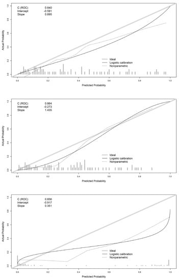 Calibration curves of logistic regression (top panel), random forest (center panel), and neural network (bottom panel) models.