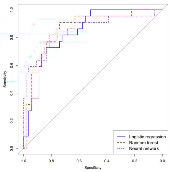 The discrimination ability of models is shown by ROC curves in Figure 8. All models show a good discrimination capacity. To compare the AUC of the models, we used the Delong comparison test. Differences between areas were not significant in our study, logistic regression vs. random forest (p = 0.561), logistic regression vs. neural networks (p = 0.736), random forest vs. neural networks (p = 0.888).