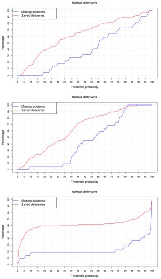 Figure 9 presents the clinical utility curves. If we choose a maximum admissible level of 5% missing acidemia cases wrongly classified, in the curves we can analyze the threshold point that corresponds to this value. For the logistic regression model, this corresponds to a 23% cut-off point, and the number of deliveries saved with a minimum loss of acidotic cases was 40.8%. For the random forest model, it corresponds to a 33% acidotic probability threshold point, with 46.1% saved deliveries. Finally, for the neural network, it corresponds to a 1% cut-off point with 25% saved deliveries. Considering the clinical utility of the models, it is clear that the random forest proved superior.