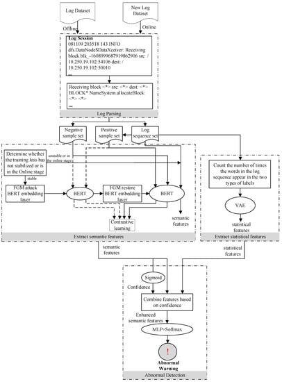 Log messages have become an essential resource for the reliability and continuity of many software systems, especially large-scale distributed systems. It truly reflects the operating status of the software system, and is of great significance to the monitoring, management and troubleshooting of the system. Therefore, log-based anomaly detection has become an important means to ensure system reliability and service quality, and its purpose is to find abnormal behavior of the system []. At present, due to the scale and complexity of modern software systems, the volume of logs has reached an unprecedented level. Therefore, for anomaly detection based on log sequences, traditional manual detection methods become impractical. With the development of artificial intelligence technology, some artificial intelligence applications, such as intelligent operation and maintenance [,,,] and intelligent transportation [], have become hot research topics. In recent years, some log sequence anomaly detection methods [,,,] have improved a lot of efficiency compared with manual detection, but they cannot fully extract the information contained in the log text, nor can they fully analyze and utilize the extracted information, which affects the accuracy of anomaly detection. In contrast, the use of deep learning methods can better learn the relationship between logs in the log sequence [,,,,,,], and then achieve more accurate log anomaly detection, but they are not sufficiently robust in practice. To detect anomalies, almost all existing approaches require the construction of a detection model using the known log events (i.e., the templates of log messages) and log sequences (i.e., series of log events that record specific execution flows) extracted from the training data. They fail to work with previously unseen log events and log sequences. However, our empirical study has found that real-world log data is unstable, meaning that new but similar log events and log sequences often appear []. In order to be able to deal with log events that have never been seen before, people have proposed the use of natural language processing to convert the log template into a semantic vector, and then the use of a deep model to learn the deep relationship contained in the semantics [,,,]. Then, a robust log anomaly detection that can deal with unknown log events is realized, but the consideration of semantic features increases the difficulty of training deep models. Abnormal logs are usually hidden in a large number of normal logs, which affects the model’s semantic learning of abnormal log sequences. Therefore, it is necessary to further standardize the semantic space of positive and negative samples, and the current log anomaly detection only relying on semantic features to deal with robustness problems is not enough, and there is a lack of a training method specifically for robustness. In addition, the current deep learning methods only focus on the log semantic features of the log sequence [,,], and do not utilize the statistical information contained in the log sequence. The core words in the abnormal log usually do not appear in the normal log or appear in the normal log with a low probability, so the statistical features can help anomaly detection proceed more smoothly.