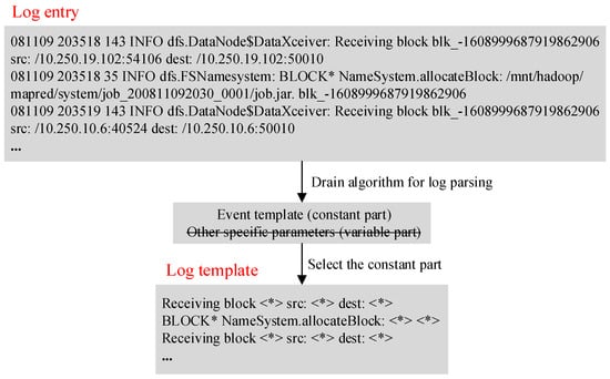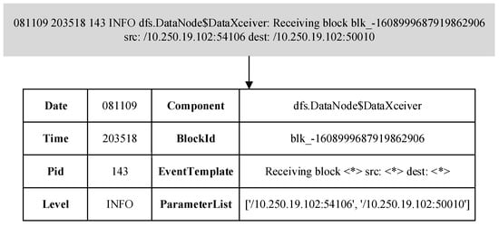 The log is unstructured and contains any form of text. The purpose of log analysis is to extract a set of event templates so that the original log can be structured. More specifically, the purpose of log analysis is to parse each log message into some specific parameters (variable part) and event templates (constant part) []. This paper uses the HDFS public data set as an example to illustrate. The information that can be parsed in a log entry in HDFS is shown in Figure 2.