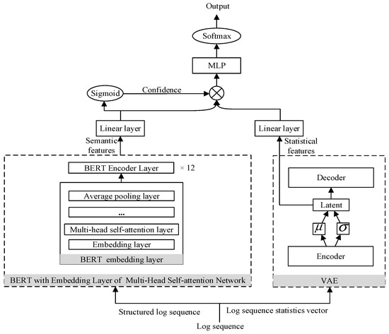 - Next, in the feature extraction stage, BERT is used to semantically encode the acquired log sequence to obtain semantic features. The number of times each word in the log sequence appears in the normal and abnormal label is counted and entered into the VAE, outputting the hidden variables to obtain statistical features.