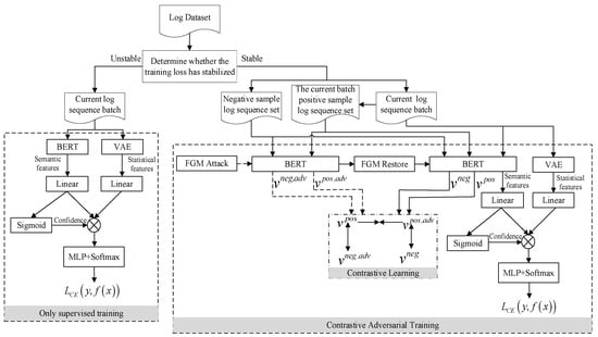 - While contrastive learning is used to increase the similarity between the semantic features generated by the normal log sequence when the embedding layer of BERT is disturbed and undisturbed, as well as to reduce the semantic features between all normal log sequences and the set of negative sample log sequences, the original supervised training task is continued to train the model. Steps 4 to 8 are repeated until the loss of contrast adversarial training stabilizes.