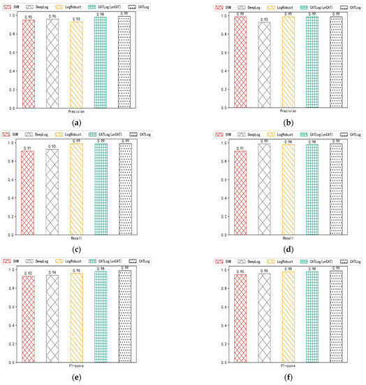 (a) Comparison of accuracy of different methods on HDFS; (b) Comparison of accuracy of different methods on BGL; (c) Comparison of recall of different methods on HDFS; (d) Comparison of recall of different methods on BGL; (e) F1-score comparison of different methods on HDFS; (f) F1-score comparison of different methods on BGL.