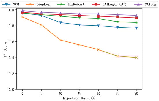After a certain percentage of the original HDFS data set is updated, anomaly detection is performed again, and the comparison result of the F1 score is shown in Figure 9. As can be seen from the figure, when the update injection reaches 5%, the F1 scores of DeepLog begin to drop significantly. When the update injection reaches 10%, the F1 score of SVM and LogRobust also begins to drop significantly. Although the F1 score of the CATLog that has not undergone contrastive adversarial training and dual feature extraction is slightly higher than SVM and LogRobust, it is also lower than the CATLog that has undergone contrastive adversarial training and dual feature extraction. It can be concluded that the CATLog proposed in this paper has better robustness than the CATLog that has not undergone contrastive adversarial training and dual feature extraction and other baseline methods. The robustness of this method in anomaly detection has been confirmed.