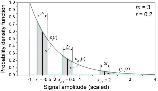 An example of a template vector and the corresponding calculated matching probabilities and equal to the shaded areas of PDF. In this example, m = 3, r = 0.2, and samples are from a normalized and centralized exponential distribution.
