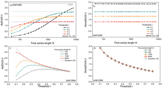 The impact of time series length N and threshold r is shown in Figure 3. Entropy is estimated from the artificial data for vector size m = 2, and the results are presented as mean ± standard deviation (SD) in Figure 3a,c, and only as a mean in Figure 3b,d. We opted to show the results of uniform distribution as its entropy can be expressed in a closed form, (18), dashed lines. The results for Gaussian and exponential distributions are similar and, for this reason, omitted.