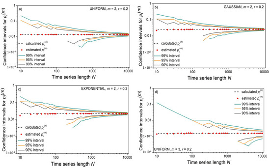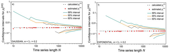 Figure 4 shows that, contrary to the mean SampEn values, its standard deviation is affected by the time series length N. To show that it is an outcome of the relationship between the number of binary events (template matches) and the series length N, we estimated confidence intervals for an illustrative example of the m = 2 template [−0.1 0.1] and m = 3 template [−0.1 0.1 0.6], following a detailed reliability analysis of binary event probability estimates from [36,43]. For each N, 104 time series were generated, and the corresponding mean probability values were both estimated and calculated, (4) and (15). The corresponding confidence intervals are shown in Figure 5 in the log–log scale. The values that are missing are equal to zero and cannot be shown as logarithms. Short time series have large confidence intervals, which causes an increased standard deviation of estimated mean values.