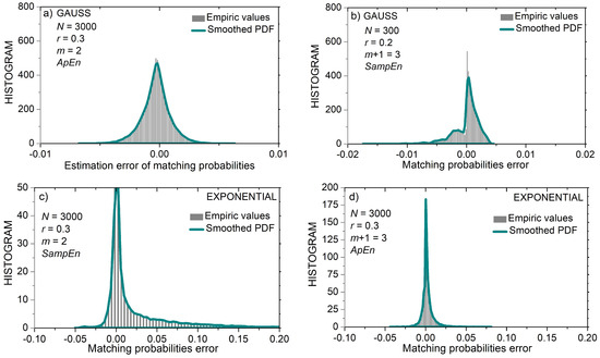 Figure 7b,d show the error distribution for m = 3 templates. Since the matching probabilities are much lower than in the previous example, and the time series is short, the errors have three peaks showing that only 1, 2, or 3 matches were found for each template. It can be seen that Figure 7d is “shifted” along the x-axis by a value of 1/(N − m) ≈ 0.336 with respect to Figure 7b. Namely, due to excluded self-matches, the number of matches in the SampEn was reduced by one if compared to ApEn. Such a shift exists in all error distributions, but it is the most clearly visible in 7b and 7d.
