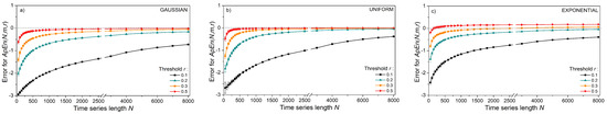 Figure 9 shows examples of error distributions in Gaussian and exponential time series. The asymmetry of the error distribution in Figure 9b is due to the very low values of calculated matching probabilities: first, these probabilities are a product of m = 3 sample probabilities (15), and second, probability of samples from tail parts of Gaussian distribution can be very low, so the templates comprising them are not likely to find more than 2–3 matches. On the other hand, the resolution of the estimated matching probabilities is too coarse, 1/(N − m), to be compared with the fine granulation of the calculated probabilities. Thus, the PDF in Figure 9b is cut into intervals. Since the error in probability is expressed as , where the first term is continuous (15) and the second discrete (4), in the first interval, the error is equal to = ; the second interval is defined as and the corresponding error values are . The remaining segments follow the same pattern.