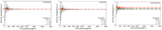Figure 10 presents the errors in entropy estimation for m = 2 and all three distributions—Gaussian, uniform, and exponential. ApEn errors (Figure 10a,b) are large and slowly converge towards zero for long data series. SampEn errors for the same distributions are different from zero for N < 500 and have a large standard deviation for N < 1500 (Figure 10d,e).