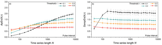 ApEn and SampEn are subject to several levels of freedom: the time series length N and the threshold r—the similarity criterion that defines (un)predictability within the time series, the length of the pattern vector (similarity) m, and the time delay τ. Their incorrect application can lead to different results within the same experimental settings (so-called “flip-flop” effect) [18,19]. Detailed parameter studies are numerous [13,20,21,22,23,24,25,26,27,28,29], with one of the most thorough analyses given recently in [30]. However, studies devoted to particular biomedical problems prefer to perform a quick search and find the parameters tuned to the signal they investigate. Thus far, guidelines or recommendations on implementation methods do not exist, despite the extensive application.