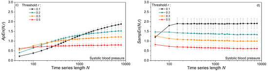 Figure 11 shows entropy as a function of time series length N, estimated from the pulse interval and systolic blood pressure of laboratory rats. For very long data series of length N > 5000, with a threshold r ≥ 0.2, the values of ApEn and SampEn are the same (Figure 11a,b). However, SampEn reaches a constant mean value for series as short as N = 500, while ApEn requires a much longer series. On the other hand, the standard deviation of ApEn is below the standard deviation of SampEn. This is a consequence of logarithms in ApEn since log-transformation is a classic method for increasing the stationarity of time series. The increased SampEn stability (smaller standard deviation) is reached with increased threshold values (Figure 12b,d). The entropy estimated from the SBP signals) is slightly lower than the entropy of the PI signal.