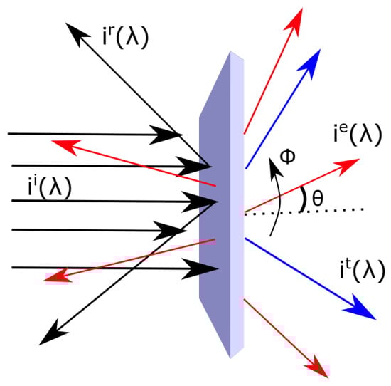 The light arriving in a parallel beam from a source and captured by the slab of material, with a fraction absorbed and emitted isotropically as a black- or grey-body spectrum and a portion reflected or transmitted with the same wavelength dependence as the incident spectrum. is the angle of the incident, emitted, reflected or transmitted beams (the last two assumed to be Lambertian), with respect to the surface normal.
