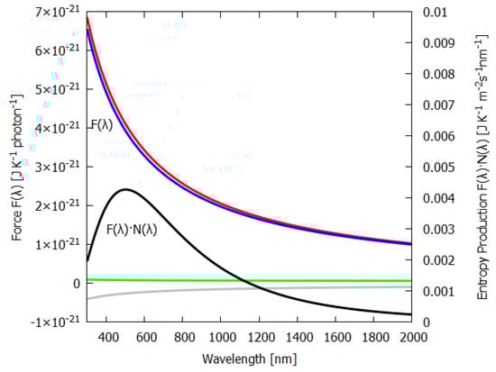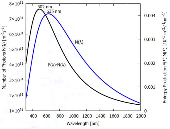 Also plotted in Figure 3 is the contribution to the entropy production, , for different wavelengths of the incident beam; the black line is for taken as a grey-body spectra at the Sun’s surface temperature, but normalized by reducing the Sun’s radius (see above) to give a solar constant of 1000 W m at Earth’s surface. Note that, for the grey-body solar spectrum, the maximum contribution to the entropy production corresponds to the wavelength bin at 502 nm and not at the peak photon intensity of the surface solar spectrum , which is at 635 nm, because, as the blue line of Figure 3 shows, the dissipation of shorter-wavelength photons has greater force and, thus, leads to greater entropy production.