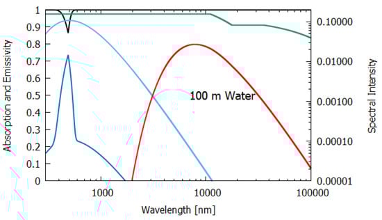 The absorption (black line) and emissivity (grey line) of water of 100 m thickness. Plotted also are the incident surface spectrum (blue) and the reflected and transmitted (violet) and emitted (red) spectra on a log–log scale (right y-axis). The data for the absorption are approximated from Chaplin [] and the data for the emissivity are taken from Huang et al. [].
