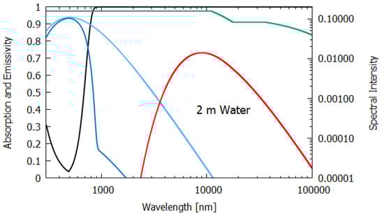 The absorption (black line) and emissivity (grey line) of water of 2 m thickness. Plotted also are the incident surface spectrum (blue) and the reflected and transmitted (violet) and emitted (red) spectra on a log–log scale (right y-axis). The data for the absorption are approximated from Chaplin [] and the data for the emissivity are taken from Huang et al. [].