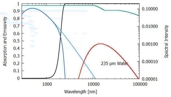 The absorption (black line) and emissivity (grey line) of water of 235 μm thickness. Plotted also are the incident surface spectrum (blue) and the reflected and transmitted (violet) and emitted (red) spectra on a log–log scale (right y-axis). The data for the absorption are taken from Chaplin [] and the data for the emissivity are taken from Huang et al. [].