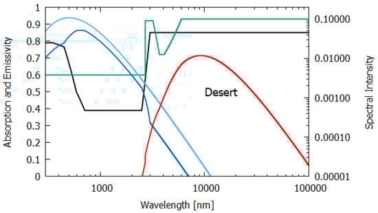 The absorption (black line) and emissivity (grey line) of a dry sand and pebble desert. Plotted also are the incident surface spectrum (blue) and the reflected and transmitted (violet) and emitted (red) spectra on a log–log scale (right y-axis). The data for the absorption are approximated from the experimental data of Pinker and Karnieli et al. [] for a semi-arid region of the Sahara and the data for the emissivity are taken from Mattar et al. [] for the Atacama desert.