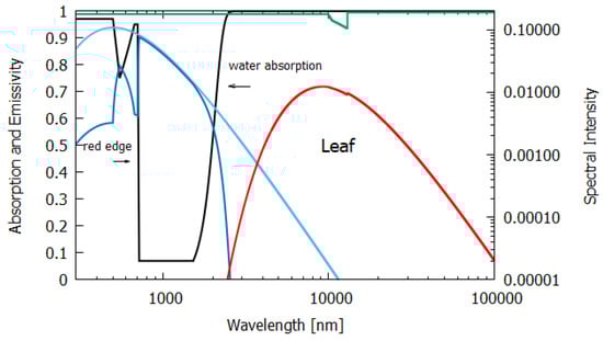 The absorption (black line) and emissivity (grey line) of a leaf. Plotted also are the incident surface spectrum (blue) and the reflected and transmitted (violet) and emitted (red) spectra on a log–log scale (right y-axis). The data for the absorption are approximated from Gates [] and the data for the emissivity are taken from Ribeiro and Crowley [] for a Cornus florida (Dogwood) leaf.