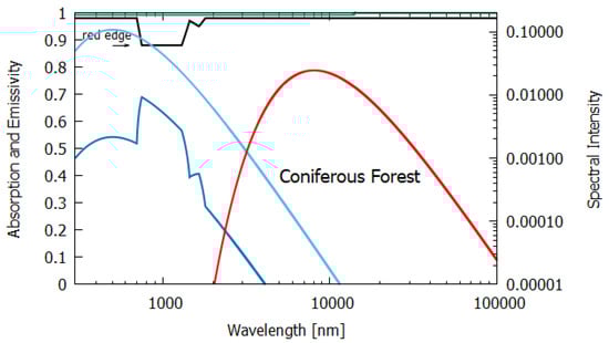 The absorption (black line) and emissivity (grey line) of a forest. Plotted also are the incident surface spectrum (blue) and the reflected and transmitted (violet) and emitted (red) spectra on a log–log scale (right y-axis). The data for the absorption are approximated from Rautiainen et al. [] for an 80-year old coniferous spruce forest and the data for the emissivity are taken from Huang et al. [].