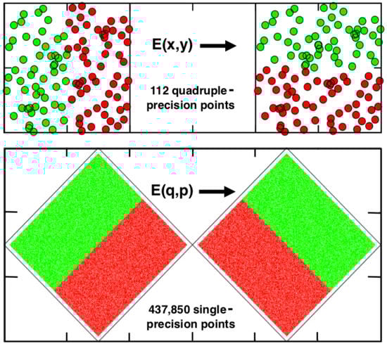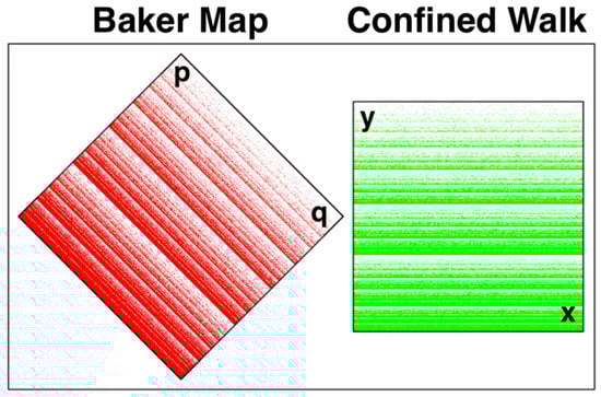 A fringe benefit of the diamond-shaped Baker Map is the relatively long Poincaré recurrence time. The computational “noise” contributing to this longevity can be traced to the irrational square roots in the mapping. The single-precision mapping which we have used in Figure 4 and Figure 5 has a periodic orbit of length just over a million iterations, 1,042,249 to be precise. The double-precision mapping settles into a periodic orbit repeating after a few trillion iterations []. The Cartesian coordinate version of the map corresponding to the orientation at the right in Figure 3 is not well suited to computation due to its many short periodic orbits, many of which are stable (which we view as “unphysical”. A clear and comprehensive analysis of the generalized Baker Map problem, with arbitrarily small and large expansions and contractions, was presented by Kumiĉák in 2005 []).