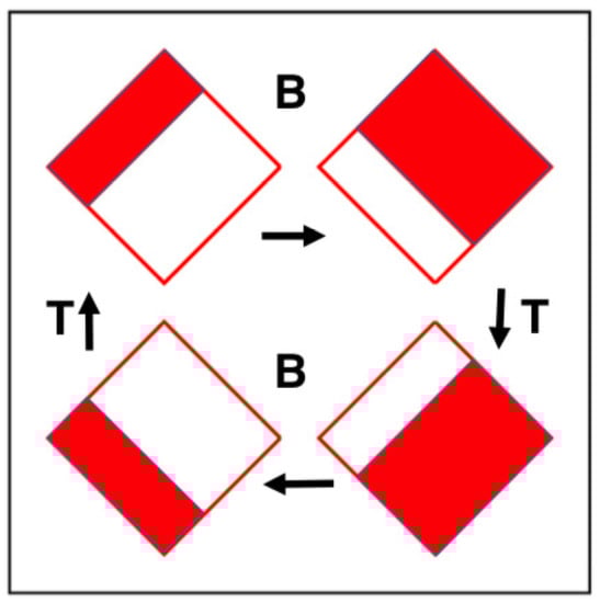 The deterministic Baker Map B doubles an area in the red region and halves an area in the white. The time-reversal Map T changes the sign of the vertical “momentum-like” variable p. The diamond-shaped domain of the map is . A counterclockwise circuit of the four states follows if B is replaced by B as T and T are identical.